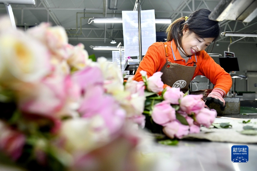 12月17日,在山東省莒縣招賢曲坊現(xiàn)代農(nóng)業(yè)產(chǎn)業(yè)園玫瑰基地,工作人員在包裝玫瑰。新華社記者 郭緒雷 攝
