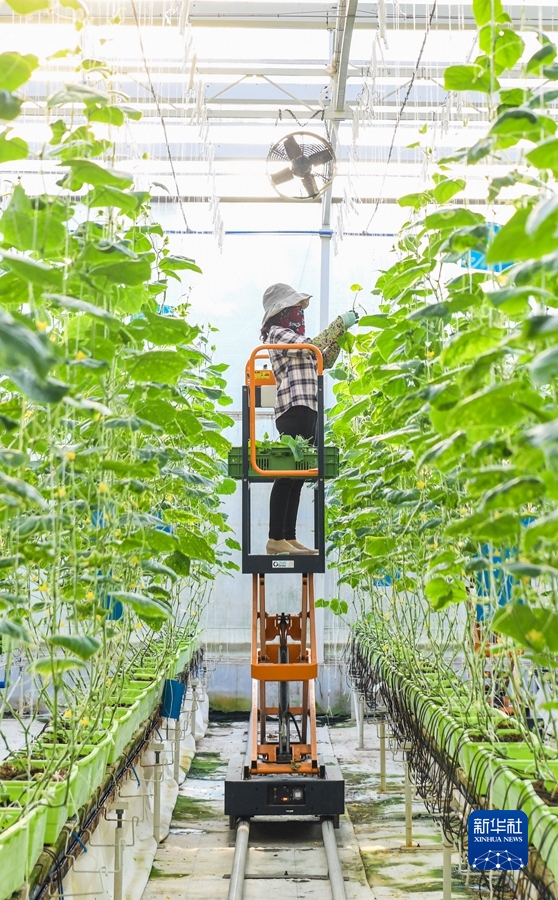 9月22日,在海南省陵水現(xiàn)代農(nóng)業(yè)示范基地,工人為黃瓜苗吊蔓。新華社記者 周佳誼 攝